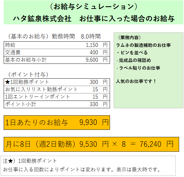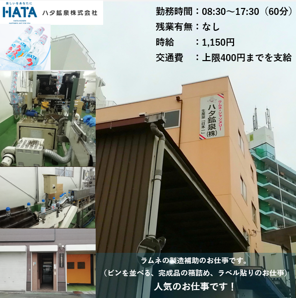 【★前払い制度あり!!】【単発!!】【週1日から!!】【シフト自由】ラムネの製造補助(ビンを並べたり、完成品を箱に詰めたり、ラベルを貼ったりするお仕事です)◆駅近!あの有名な飲むラムネ飲料の製造補助!! ■リアルタイム振込申請可能(QRで出勤・退勤を読み取るだけ)!◆QR読取実施は徹底お願いいたします。チェックイン・チェックアウトの2回。読み取れず、現場様で勤怠確認できなければ、勤務計上できない場合が発生します。 ★どうしてもQRを読み取りされなかった場合は、出発報告、完了報告が処理されていたら、翌日16時以降に申請可能(土曜日作業分は、翌週月曜日の16時以降) ■交通費上限400円までを支給。給与と一緒に振り込まれます。★重要★出勤時に検温を実施致します。その際、37.5℃以上の方は、勤務できません。また、給与保証等はございません。悪しからずご了承ください。