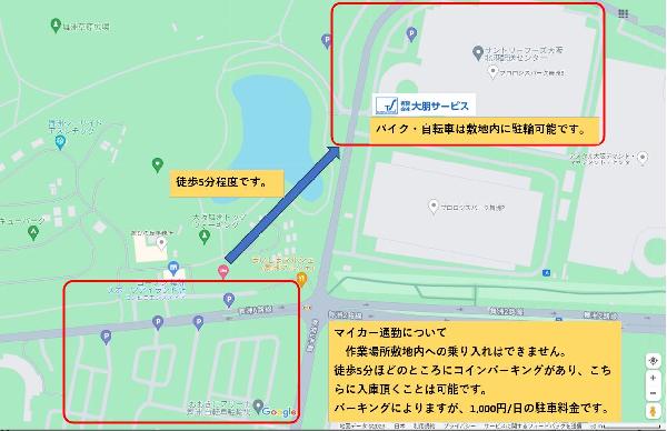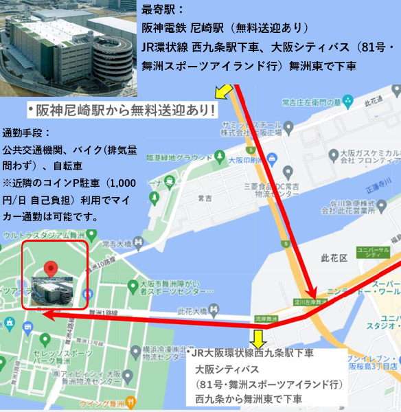 マイカー通勤は敷地内駐車は不可ですが、周辺のコインパーキング利用は可能です。バイク(排気量問わず)、自転車通勤オッケー!!※バス利用の方は西九条駅前からの大阪シティバスを利用されると便利です。バスルートは道案内に記載しております。