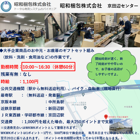 【★前払い制度あり!!】【単発!!】【週1日から!!】【シフト自由】大手企業商品のお中元・お歳暮のギフトセット組み(飲料・洗剤・食用油など)等※京阪中書島駅または近鉄新田辺駅から無料送迎バスあり!■田辺送迎枠・中書島送迎枠を確認してからエントリーして下さい