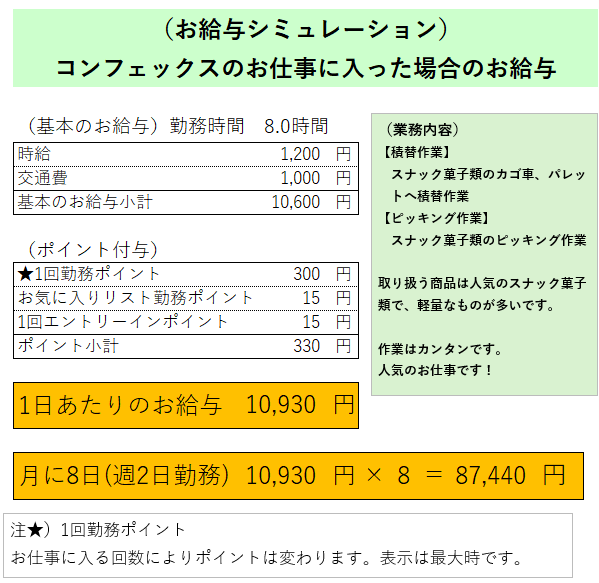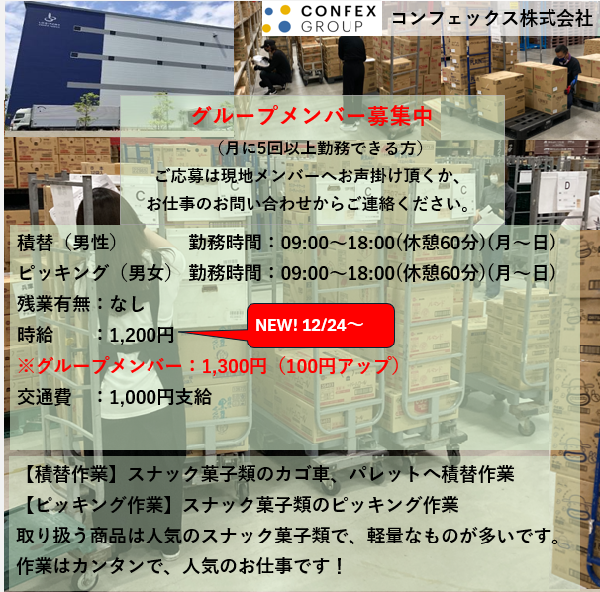 商品はお菓子類ですので軽い商品が多いです!!月に5回以上勤務出来る方、グループメンバー募集中!★お仕事内容動画!是非ご覧ください!!お仕事内容動画(YouTube)→https://youtube.com/shorts/_YHOeA-6PCg 最寄のバス停からの道案内動画→https://www.youtube.com/shorts/9X5hVUGAVcg>